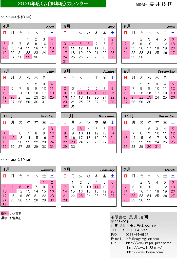 長井技研の営業日カレンダーです。ご活用下さい。