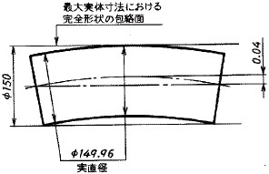 ![]() 図3(c) ![]() 図3(d) したがって、すべての個々の実直径が最大実体寸法φ150である場合には、軸は正確に円筒形状でなければならない[ 図3(e) 参照]。 ![]() 図3(e)